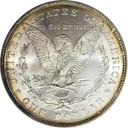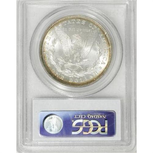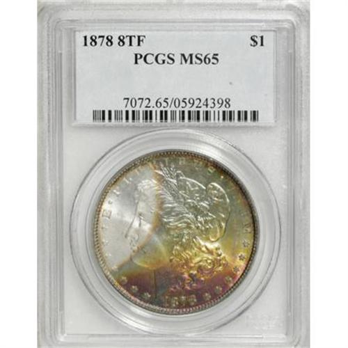 <B>1878 8TF $1 MS65 PCGS.</B></I> VAM-17. Beautiful arcs of ruby-red, sky-blue, and lemon endow most of the obverse. The reverse is brilliant save for slender peripheral bands of golden-brown and jade-green. Precisely struck and lustrous with a well preserved reverse and a clean left obverse field. The lower cheek and the field behind the cap have moderate marks. A prize for the connoisseur of patinated coinage.<BR><BR><B>Coin Engraver:</B> George T. Morgan<BR><BR><b>Shipping:</b> Coins & Currency (<a target="_blank" href="http://www.heritageauctions.com/common/shipping.php">view shipping information</a>)