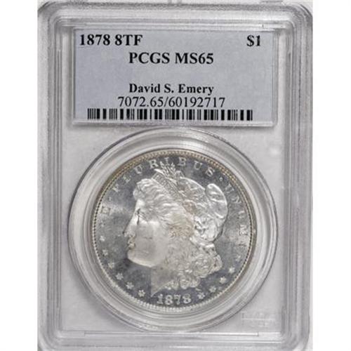 <B>1878 8TF $1 MS65 PCGS.</B></I> Ex: David S. Emery. PCGS Population (426/32). NGC Census: (321/17). Mintage: 699,300. Numismedia Wsl. Price for NGC/PCGS coin in MS65: $1,050. (#7072)<BR><BR><B>Coin Engraver:</B> George T. Morgan<BR><BR><b>Shipping:</b> Coins & Currency (<a target="_blank" href="http://www.heritageauctions.com/common/shipping.php">view shipping information</a>)
