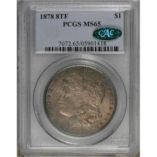 <B>1878 8TF $1 MS65 PCGS. CAC.</B></I> VAM-21. Light peach-gray dominates the obverse, although the margin offers cherry-wine and powder-blue shades. The reverse is principally brilliant. A satiny Gem with well struck centers and minor incompleteness on the claws and lower wreath.<BR><BR><B>Coin Engraver:</B> George T. Morgan<BR><BR><b>Shipping:</b> Coins & Currency (<a target="_blank" href="http://www.heritageauctions.com/common/shipping.php">view shipping information</a>)