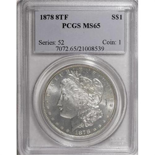 <B>1878 8TF $1 MS65 PCGS.</B></I> VAM-21. Delicate gold toning visits this lustrous and intricately impressed Gem. Splendidly devoid of marks, and worthy of a quality Morgan holding.<BR><BR><B>Coin Engraver:</B> George T. Morgan<BR><BR><b>Shipping:</b> Coins & Currency (<a target="_blank" href="http://www.heritageauctions.com/common/shipping.php">view shipping information</a>)