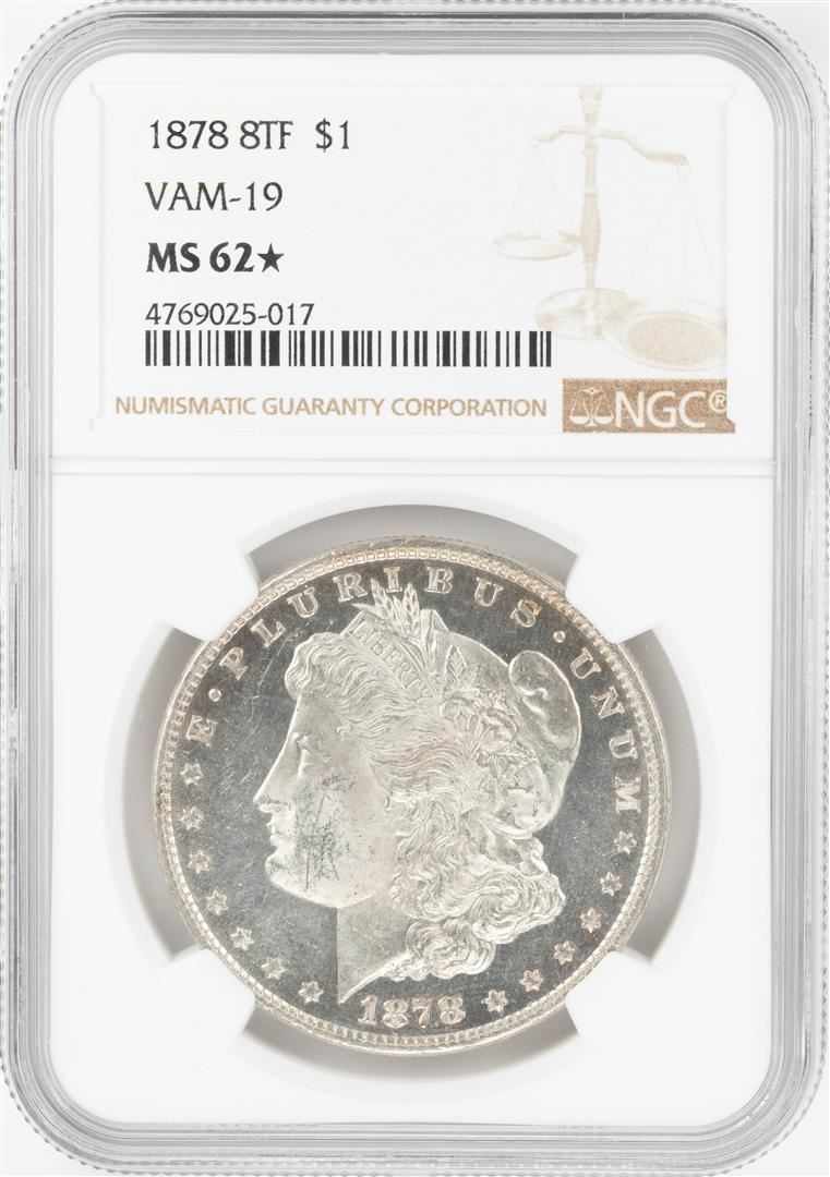 One 1878 8TF $1 Morgan Silver Dollar Coin NGC MS62 Star VAM-19. NGC Certified.