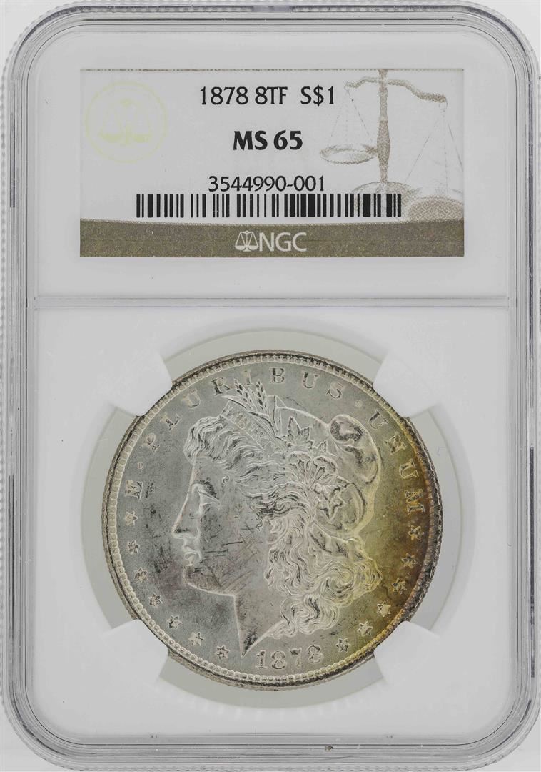 One 1878 8TF $1 Morgan Silver Dollar Coin NGC MS65. NGC Certified.