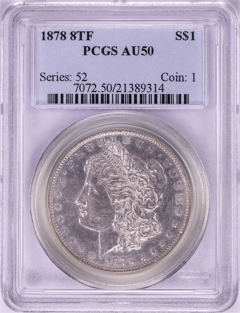 One 1878 8TF $1 Morgan Silver Dollar Coin PCGS AU50. PCGS Graded.