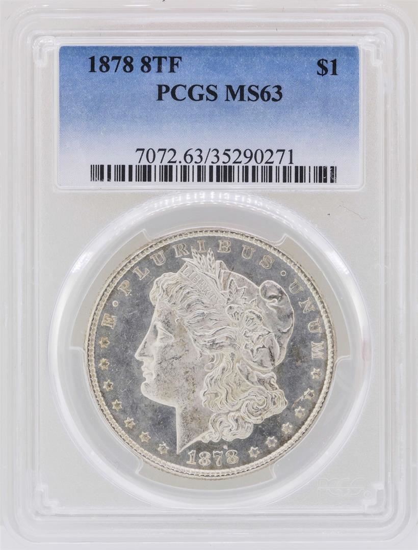 One 1878 8TF $1 Morgan Silver Dollar Coin PCGS MS63. PCGS Graded.