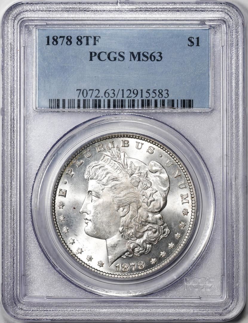 One 1878 8TF $1 Morgan Silver Dollar Coin PCGS MS63. PCGS Graded.