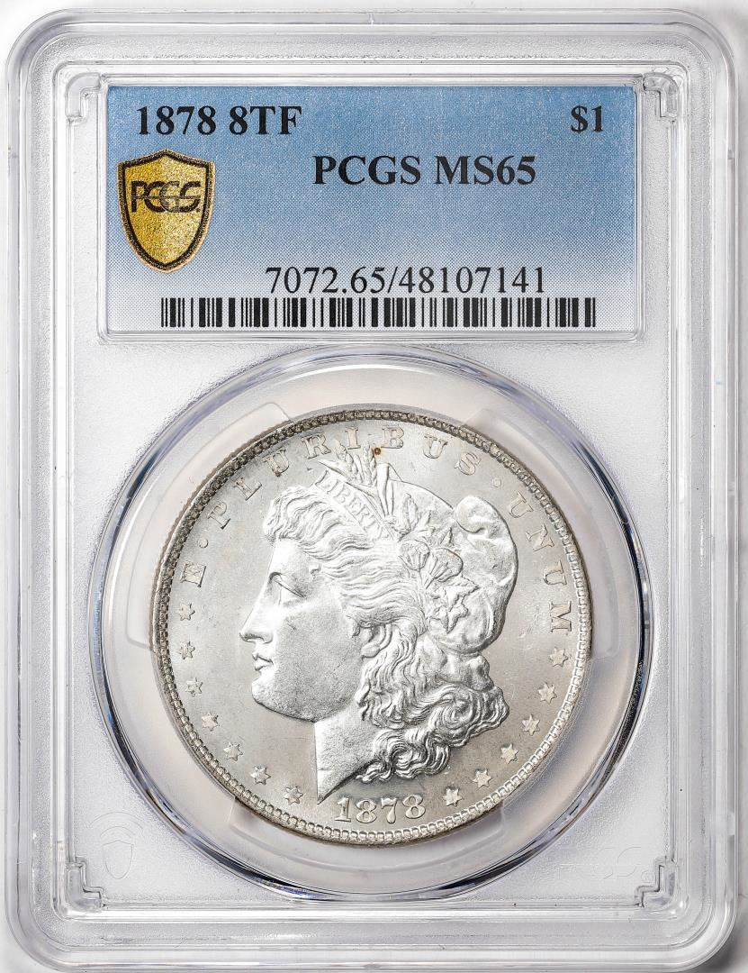 One 1878 8TF $1 Morgan Silver Dollar Coin PCGS MS65. PCGS Graded.