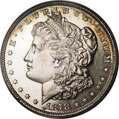<B>1878 8TF $1 PR61 Cameo PCGS.</B></I> VAM-14.3. A brilliant proof with delicate champagne toning accompanied by splashes of gold and pale blue at the top of the obverse and bottom of the reverse. Most proof 1878 Morgan dollars feature the eight tailfeathers reverse, struck early in the year. Later proofs were coined after the change to the seven tailfeathers proofs. Conventional wisdom suggests mintages of 500 and 250 coins respectively.<BR><BR><b>Shipping:</b> Coins & Currency (<a target="_blank" href="http://www.heritageauctions.com/common/shipping.php">view shipping information</a>)