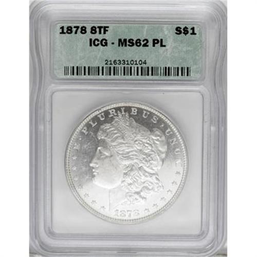 <B>1878 8TF $1 MS62 Prooflike ICG.</B></I> VAM-1. 188 reeds, per the consignor. NGC Census: (119/304). PCGS Population (190/345). Numismedia Wsl. Price for NGC/PCGS coin in MS62: $135. (#7073)<BR><BR><B>Coin Engraver:</B> George T. Morgan<BR><BR><b>Shipping:</b> Coins & Currency (<a target="_blank" href="http://www.heritageauctions.com/common/shipping.php">view shipping information</a>)