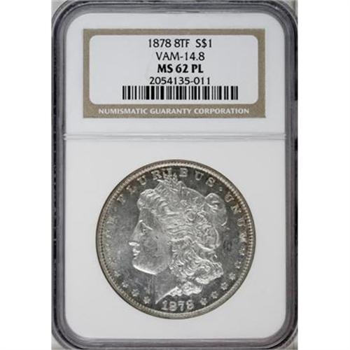 <B>1878 8TF $1 MS62 Prooflike NGC.</B></I> VAM-14.8. NGC Census: (122/307). PCGS Population (190/346). Numismedia Wsl. Price for NGC/PCGS coin in MS62: $135. (#7073)<BR><BR><B>Coin Engraver:</B> George T. Morgan<BR><BR><b>Shipping:</b> Coins & Currency (<a target="_blank" href="http://www.heritageauctions.com/common/shipping.php">view shipping information</a>)