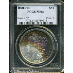<B>1878 8TF<img border='0' src='http://www.heritagecoins.com/images/star.gif' width=10 height=10>$1 MS64 PCGS.</B></I> Deep multicolored toning over most of the obverse, while the reverse is nearly untoned. Sharply struck throughout. Lot:9873