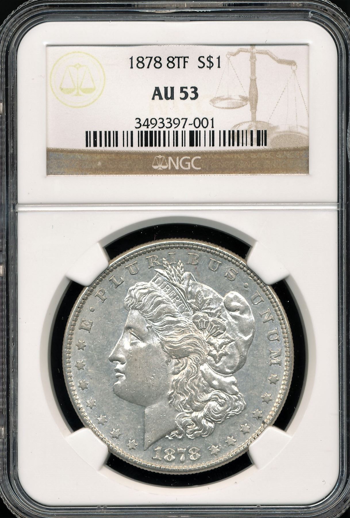 In 1878, the brand new Morgan dollar design made its debut. The original design featured an eagle with 8 tail feathers. However, it was soon discovered that this was an incorrect number as bald eagles always have an uneven number of tail feathers. Only three-quarters of a million Morgans were struck with the 8TF design before the change was made, making this a rare and popular variety for the Morgan dollar series.