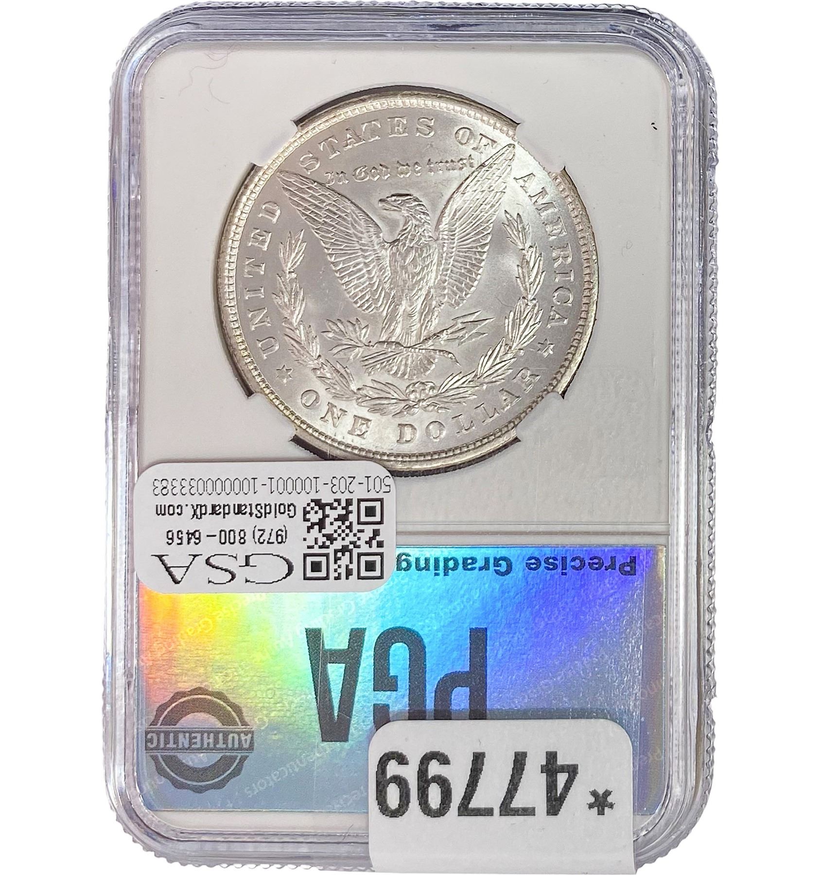e. Coins sold referencing a third-party grading service are sold “AS IS” without any express or implied warranty, except for a guarantee by GSA that they are genuine. Removal or alteration of the holder, voids all of Bidder’s claims concerning that Product. Certain warranties may be available from the grading services and Bidders are referred to them for further details: Numismatic Guaranty Corporation (NGC), PO Box 4776, Sarasota, FL 34230, www.ngccoin.com/services/writtenguarantee.asp; Professional Coin Grading Services (PCGS), PO Box 9458, Newport Beach, CA 92658, www.pcgs.com/guarantee.html; ANACS, 6555 S. Kenton St., Ste. 303, Englewood, CO 80111; and Independent Coin Grading Co. (ICG), 7901 East Bellview, Ave., Suite 50, Englewood, CO 80111.