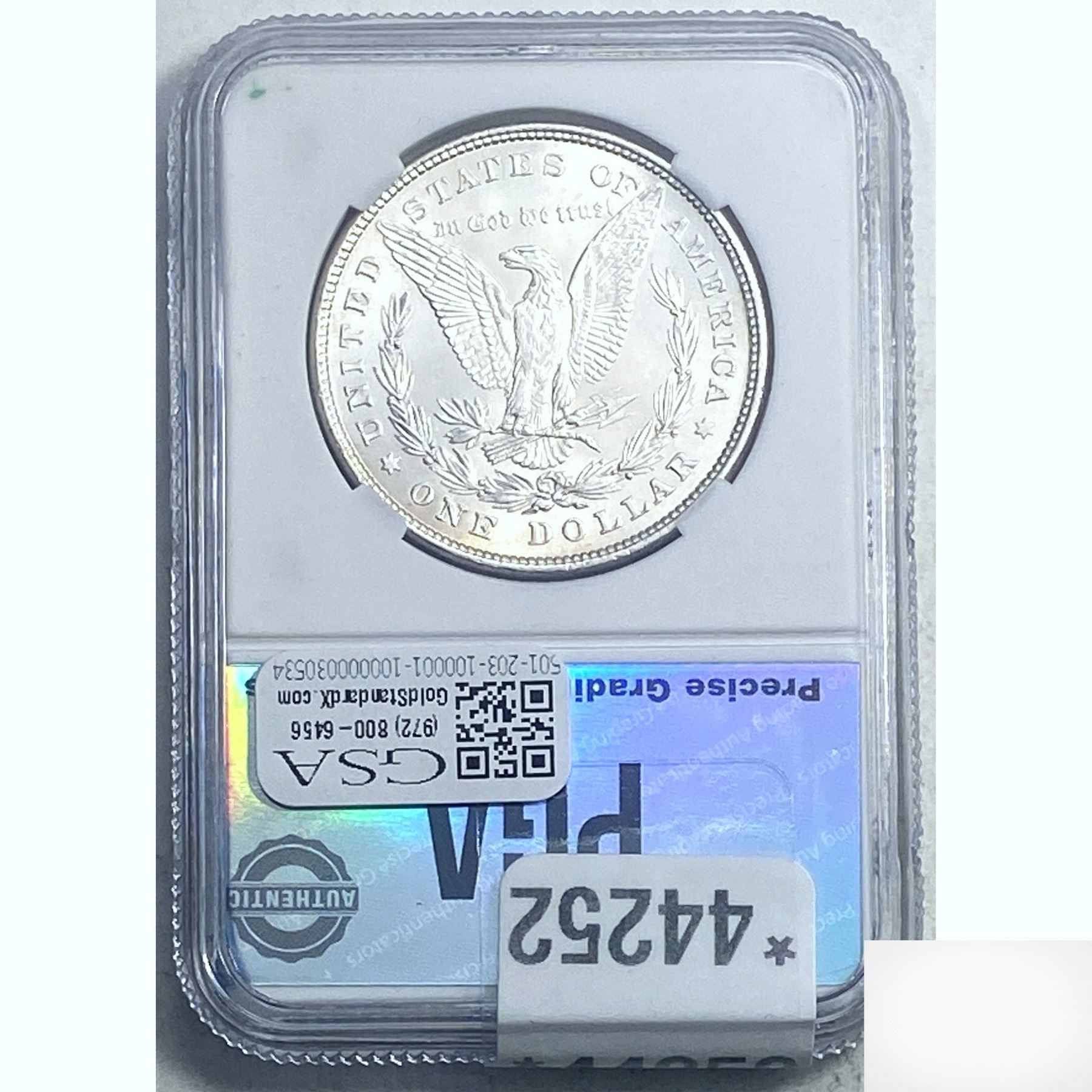 COINS AND CURRENCY LISTED IN GSA’S CATALOG AS GRADED AND ENCAPSULATED BY PCGS, NGC, ANACS, ICG, PCGS CURRENCY, PMG, PCGS BANKNOTE GRADING, CMC OR ANY OTHER THIRD-PARTY GRADING SERVICE ARE LIKEWISE SOLD “AS-IS” EXCEPT AS EXPRESSLY SET FORTH HEREIN. ALL THIRD-PARTY GRADING SERVICE GUARANTEES, INCLUDING AUTHENTICITY, ARE THE SOLE RESPONSIBILITY OF THE THIRD-PARTY GRADING SERVICE AND NOT WARRANTIES OR GUARANTEES OF GSA. BIDDERS SHOULD CONTACT THESE THIRD-PARTY GRADING SERVICES DIRECTLY WITH RESPECT TO ANY CLAIMS OR QUESTIONS THEY MAY HAVE CONCERNING THEIR GUARANTEES AND WARRANTIES. BIDDERS ACKNOWLEDGE AND AGREE THAT AUCTIONEER IS NOT BOUND BY OR LIABLE FOR ANY OPINION OR CERTIFICATION BY ANY THIRD-PARTY GRADING SERVICE. REMOVAL OF A PRODUCT FROM ITS PROTECTIVE CASING OR HOLDER OR ALTERATION OF ANY COIN HOLDER WAIVES ALL RIGHTS CONCERNING THE PRODUCT CONTAINED THEREIN.