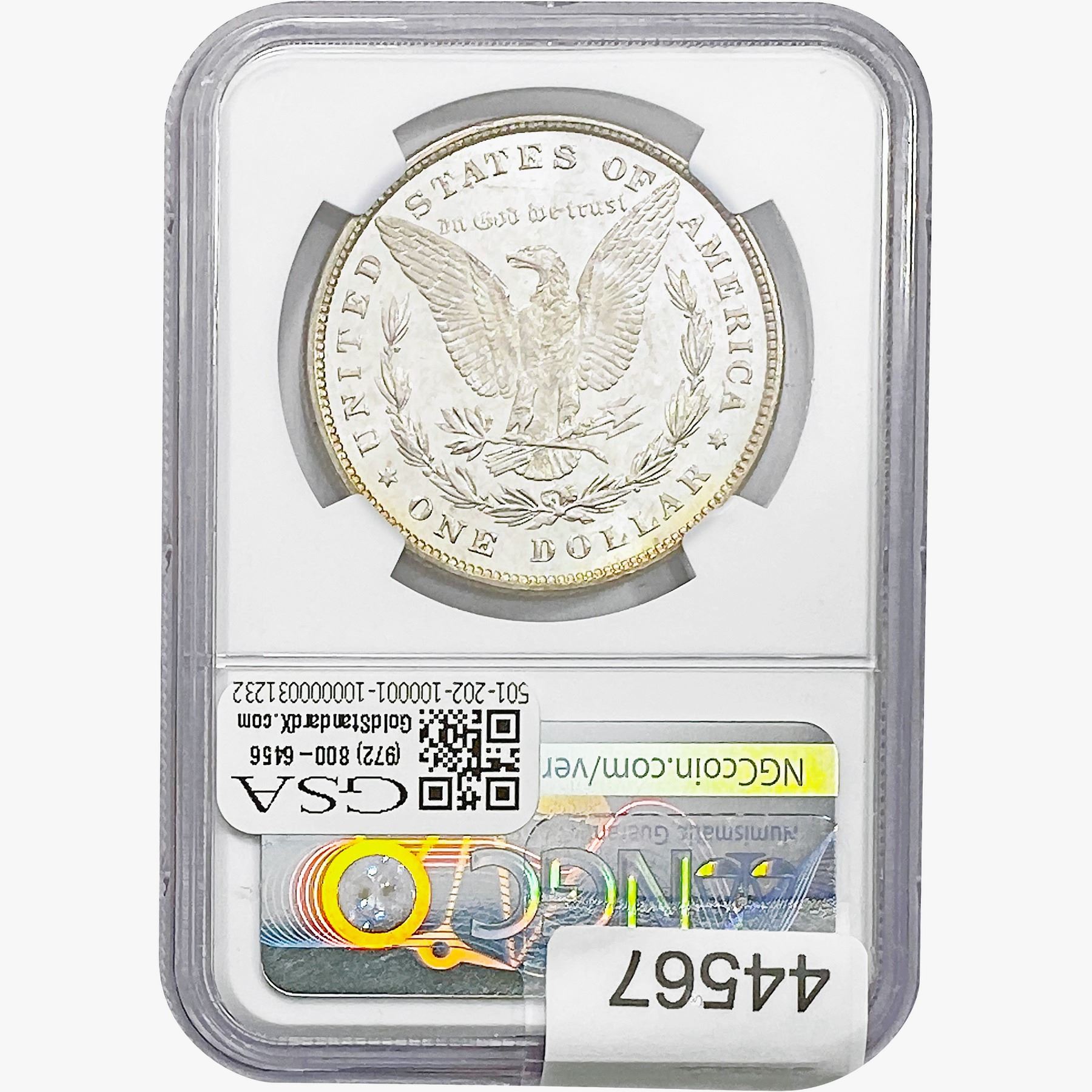 e. Coins sold referencing a third-party grading service are sold “AS IS” without any express or implied warranty, except for a guarantee by GSA that they are genuine. Removal or alteration of the holder, voids all of Bidder’s claims concerning that Product. Certain warranties may be available from the grading services and Bidders are referred to them for further details: Numismatic Guaranty Corporation (NGC), PO Box 4776, Sarasota, FL 34230, www.ngccoin.com/services/writtenguarantee.asp; Professional Coin Grading Services (PCGS), PO Box 9458, Newport Beach, CA 92658, www.pcgs.com/guarantee.html; ANACS, 6555 S. Kenton St., Ste. 303, Englewood, CO 80111; and Independent Coin Grading Co. (ICG), 7901 East Bellview, Ave., Suite 50, Englewood, CO 80111.