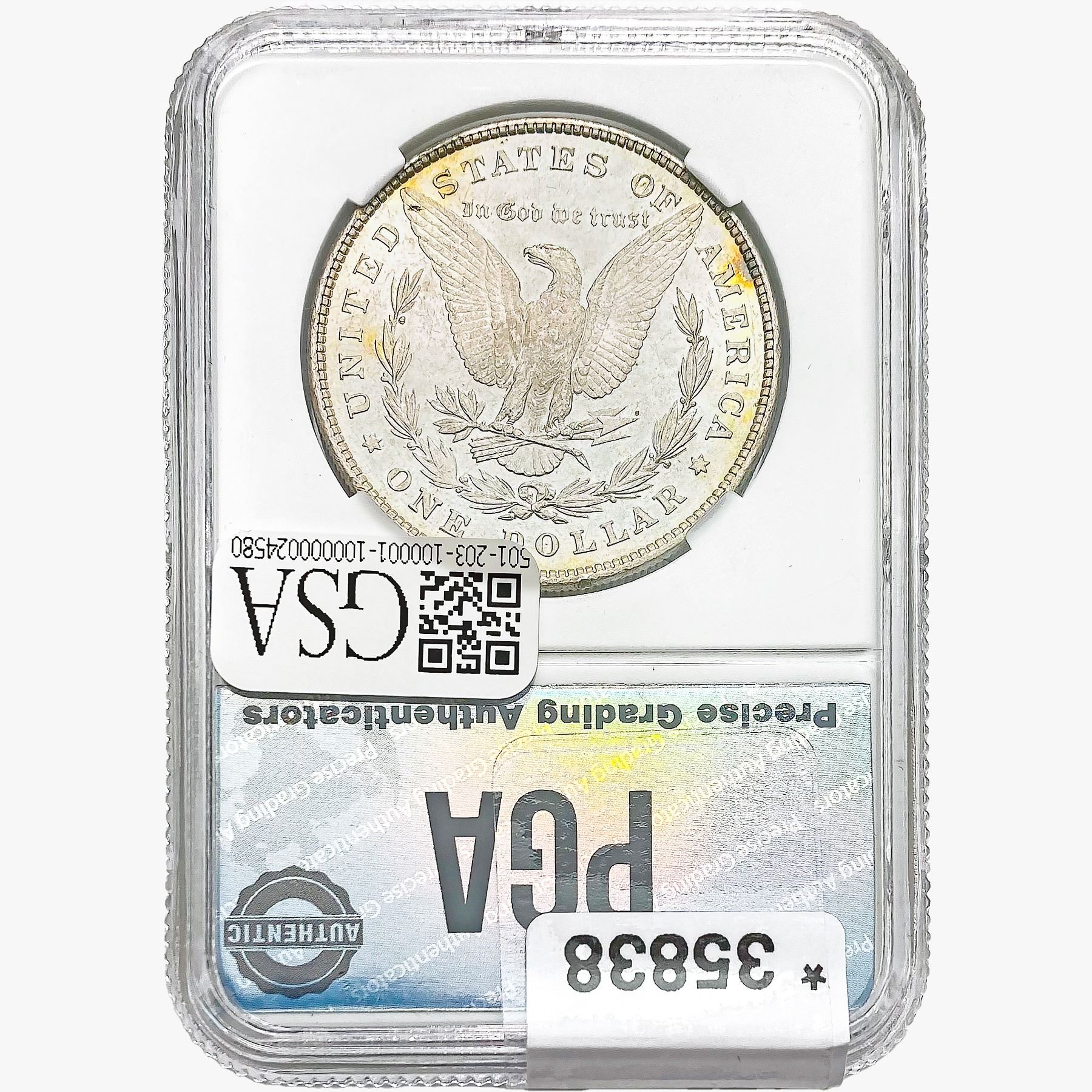 COINS AND CURRENCY LISTED IN GSA’S CATALOG AS GRADED AND ENCAPSULATED BY PCGS, NGC, ANACS, ICG, PCGS CURRENCY, PMG, PCGS BANKNOTE GRADING, CMC OR ANY OTHER THIRD-PARTY GRADING SERVICE ARE LIKEWISE SOLD “AS-IS” EXCEPT AS EXPRESSLY SET FORTH HEREIN. ALL THIRD-PARTY GRADING SERVICE GUARANTEES, INCLUDING AUTHENTICITY, ARE THE SOLE RESPONSIBILITY OF THE THIRD-PARTY GRADING SERVICE AND NOT WARRANTIES OR GUARANTEES OF GSA. BIDDERS SHOULD CONTACT THESE THIRD-PARTY GRADING SERVICES DIRECTLY WITH RESPECT TO ANY CLAIMS OR QUESTIONS THEY MAY HAVE CONCERNING THEIR GUARANTEES AND WARRANTIES. BIDDERS ACKNOWLEDGE AND AGREE THAT AUCTIONEER IS NOT BOUND BY OR LIABLE FOR ANY OPINION OR CERTIFICATION BY ANY THIRD-PARTY GRADING SERVICE. REMOVAL OF A PRODUCT FROM ITS PROTECTIVE CASING OR HOLDER OR ALTERATION OF ANY COIN HOLDER WAIVES ALL RIGHTS CONCERNING THE PRODUCT CONTAINED THEREIN.
