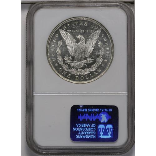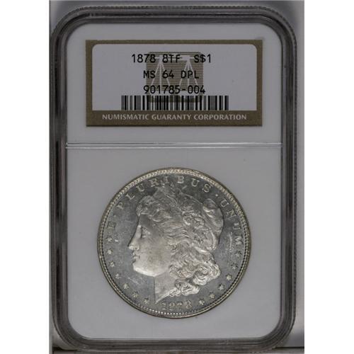 <B>1878 8TF<img border='0' src='http://www.heritagecoins.com/images/star.gif' width=10 height=10>$1> MS64 Deep Mirror Prooflike NGC.</B></I> VAM-2. A brilliant and well struck Eight Tailfeather dollar with dramatic depth of reflectivity in the fields, a characteristic often associated with the VAM-2 marriage. Moderate field marks are seen here and there, but the portrait is unblemished.