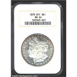 1878 8TF S$1 MS64 NGC. Nearly full-white with a bit of cobalt-blue obverse peripheral toning. The surfaces are minimally abraded and the hair above Liberty's ear a tad softly struck. Important notice: We expect to be auctioning lots at the rate of 200-250 per hour. Sometimes eBay Premier live bid software cannot keep up with that pace, so we strongly recommend that you place a realistic proxy bid now as insurance to avoid disappointment. Also please note that all Heritage/CAA lots purchased through eBay Premier carry a 20% Buyer's Premium. Please make sure you read the Terms and Conditions.