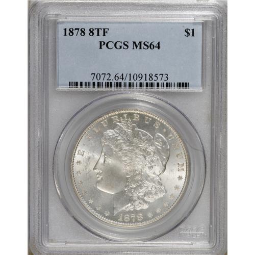 <B>1878 8TF S$1 MS64 PCGS.</B></I> VAM-14.2. A lovely example of Morgan's first reverse, Choice with strong luster and excellent detail. Light abrasions are present in the fields, and small areas of deep chocolate-brown toning are present near the eagle's right (facing) leg and talons.<BR><BR><b>Shipping:</b> Coins & Currency (<a target="_blank" href="http://www.heritageauctions.com/common/shipping.php">view shipping information</a>)