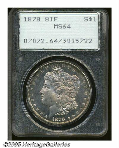 <B>1878 8TF<S$1> MS64 PCGS.</B></I> VAM-17. Lustrous surfaces are overlain by a thin layer of gold-beige patina on the obverse, while the reverse is nearly untoned. The design features are well impressed, though the hair above Liberty's ear is a trifle soft. A few grade-limiting marks are noted on Liberty's face and on the eagle's breast.