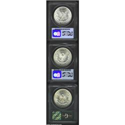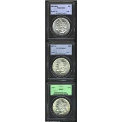 1878 8TF S$1 MS64 PCGS, nicely struck and lustrous, tan color on the cheek, LIBERTY and the olive leaves are lightly die doubled; 1879-O MS63 PCGS, well struck and lustrous with a clean reverse and a few minor obverse abrasions; and an 1891 MS63 PCGS, nicely struck with flashy luster and gold patina in the reverse center, a reeding mark is near Liberty's eye. 3 coins Important notice: We expect to be auctioning lots at the rate of 200-250 per hour. Sometimes eBay Premier live bid software cannot keep up with that pace, so we strongly recommend that you place a realistic proxy bid now as insurance to avoid disappointment. Also please note that all Heritage/CAA lots purchased through eBay Premier carry a 20% Buyer's Premium. Please make sure you read the Terms and Conditions.
