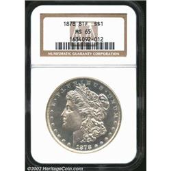 1878 8TF S$1 MS65 NGC. Both sides are die doubled, which is most noticeable on LIBERTY and ONE. A brilliant, well struck, and lustrous Gem that has pleasing surfaces. Important notice: We expect to be auctioning lots at the rate of 200-250 per hour. Sometimes eBay Premier live bid software cannot keep up with that pace, so we strongly recommend that you place a realistic proxy bid now as insurance to avoid disappointment. Also please note that all Heritage/CAA lots purchased through eBay Premier carry a 20% Buyer's Premium. Please make sure you read the Terms and Conditions.