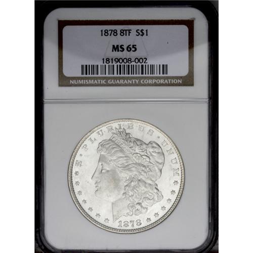 <B>1878 8TF<img border='0' src='http://www.heritagecoins.com/images/star.gif' width=10 height=10>$1> MS65 NGC.</B></I> VAM-17. Brilliant white surfaces with a satiny appearance in the fields. The strike is nice and both sides are free of significant flaws. <BR><BR><B>Important notice:</B> Heritage usually auctions material at the rate of 200-250 lots per hour. On some occasions eBay Live bid software or the Internet may not be able to keep up with the pace of the auction. We recommend placing a realistic absentee bid now as insurance to avoid disappointment. Occasionally the auctioneer may eliminate or reject an eBay Live bid, and the auctioneer may also reopen a lot after the close of the eBay live bidding (usually because we missed an audience bid), and may reject your bid even if it shows you as the winning bidder. By bidding via eBay Live, you agree that Heritage may award the lot to another bidder at its sole discretion under the circumstances described above or any other reasonable circumstances. Since eBay bids are not shown to us until we open the lot on the floor, we treat those bids just like floor bids. In most cases the floor responds before the eBay bid is presented to us, due to Internet lag time, so for consistency we have made it a policy that floor bids are always considered first over tie eBay live bids. Also please note that all Heritage lots purchased through eBay Live carry a 20% Buyer's Premium. Please make sure you read the Terms and Conditions before you bid. This lot is being auctioned in conjunction with a live floor auction by Heritage Galleries & Auctioneers. All final auction and invoice information will be supplied by Heritage Galleries & Auctioneers, and all other information should be considered preliminary. Lot:3183 <BR><BR><B>Winning Notification and Billing:</B> After the FINAL session in this auction is complete, Heritage will send e-mail and snail mail invoices. This process normally takes several days. All final auction and invoice information will be supplied by Heritage Galleries & Auctioneers, and all other information should be considered preliminary. <BR><BR>This auction will be conducted on a live auction floor and over the Internet through eBay Live. If you choose to place an absentee bid, please take a moment to <font color='#0000ff'><u><a href='http://pages.ebay.com/liveauctions/help/before/laabsentee.html'>learn how eBay Live absentee bidding works</a></u></font><font color='#000000'>