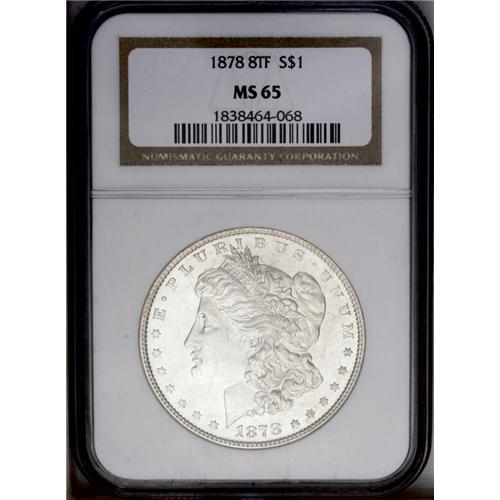 <B>1878 8TF<img border='0' src='http://www.heritagecoins.com/images/star.gif' width=10 height=10>$1> MS65 NGC.</B></I> VAM-21. Bright lustrous surfaces display occasional wisps of light tan-gold color around some of the margins. The design features are well impressed. A few minute marks on the cheek and in the left obverse field are mentioned for accuracy. NGC has certified only 14 pieces finer (3/06). <BR><BR><B>Important notice:</B> Heritage usually auctions material at the rate of 200-250 lots per hour. On some occasions eBay Live bid software or the Internet may not be able to keep up with the pace of the auction. We recommend placing a realistic absentee bid now as insurance to avoid disappointment. Occasionally the auctioneer may eliminate or reject an eBay Live bid, and the auctioneer may also reopen a lot after the close of the eBay live bidding (usually because we missed an audience bid), and may reject your bid even if it shows you as the winning bidder. By bidding via eBay Live, you agree that Heritage may award the lot to another bidder at its sole discretion under the circumstances described above or any other reasonable circumstances. Since eBay bids are not shown to us until we open the lot on the floor, we treat those bids just like floor bids. In most cases the floor responds before the eBay bid is presented to us, due to Internet lag time, so for consistency we have made it a policy that floor bids are always considered first over tie eBay live bids. Also please note that all Heritage lots purchased through eBay Live carry a 20% Buyer's Premium. Please make sure you read the Terms and Conditions before you bid. This lot is being auctioned in conjunction with a live floor auction by Heritage Galleries & Auctioneers. All final auction and invoice information will be supplied by Heritage Galleries & Auctioneers, and all other information should be considered preliminary. Lot:3184 <BR><BR><B>Winning Notification and Billing:</B> After the FINAL session in this auction is complete, Heritage will send e-mail and snail mail invoices. This process normally takes several days. All final auction and invoice information will be supplied by Heritage Galleries & Auctioneers, and all other information should be considered preliminary. <BR><BR>This auction will be conducted on a live auction floor and over the Internet through eBay Live. If you choose to place an absentee bid, please take a moment to <font color='#0000ff'><u><a href='http://pages.ebay.com/liveauctions/help/before/laabsentee.html'>learn how eBay Live absentee bidding works</a></u></font><font color='#000000'>