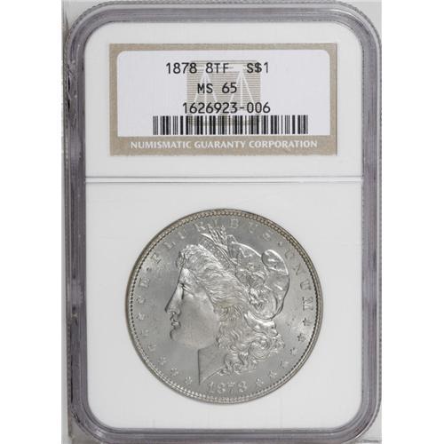 <B>1878 8TF<img border='0' src='http://www.heritagecoins.com/images/star.gif' width=10 height=10>$1> MS65 NGC.</B></I> VAM-4. This Gem displays attractive silver-gray frosty surfaces that are remarkably clean and well preserved, save for a few trivial grazes on Liberty's cheek. Except for slight softness in the hair over Liberty's ear, the design elements are well impressed.