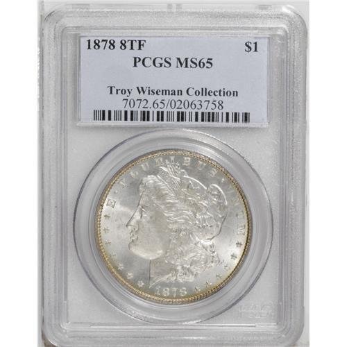 <B>1878 8TF<img border='0' src='http://www.heritagecoins.com/images/star.gif' width=10 height=10>$1> MS65 PCGS.</B></I> VAM-17. LIBERTY and the wreath are noticeably die doubled. A semi-prooflike Gem with peripheral lemon color and a bold strike. Lovingly preserved and attractive.<BR><I>From The Troy Wiseman Collection.</B></I>