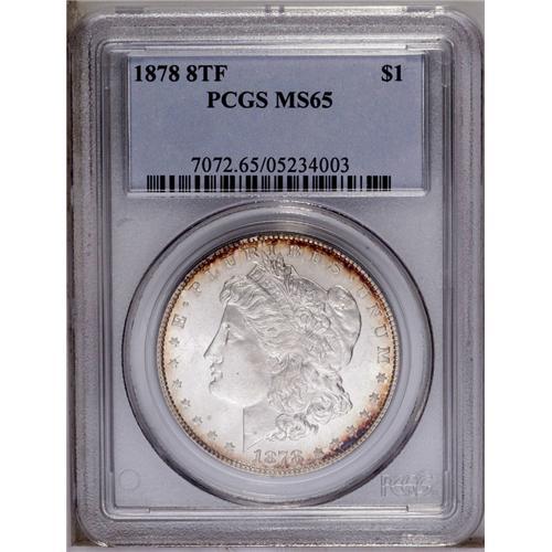 <B>1878 8TF<img border='0' src='http://www.heritagecoins.com/images/star.gif' width=10 height=10>$1> MS65 PCGS.</B></I> VAM-17. This is a highly appealing Gem with frosty silver luster on both sides, accented by a thin band of peripheral rose and iridescent toning along the borders on both sides. Few finer examples (28 as of 3/06) have been certified by PCGS. <BR><BR><B>Important notice:</B> Heritage usually auctions material at the rate of 200-250 lots per hour. On some occasions eBay Live bid software or the Internet may not be able to keep up with the pace of the auction. We recommend placing a realistic absentee bid now as insurance to avoid disappointment. Occasionally the auctioneer may eliminate or reject an eBay Live bid, and the auctioneer may also reopen a lot after the close of the eBay live bidding (usually because we missed an audience bid), and may reject your bid even if it shows you as the winning bidder. By bidding via eBay Live, you agree that Heritage may award the lot to another bidder at its sole discretion under the circumstances described above or any other reasonable circumstances. Since eBay bids are not shown to us until we open the lot on the floor, we treat those bids just like floor bids. In most cases the floor responds before the eBay bid is presented to us, due to Internet lag time, so for consistency we have made it a policy that floor bids are always considered first over tie eBay live bids. Also please note that all Heritage lots purchased through eBay Live carry a 20% Buyer's Premium. Please make sure you read the Terms and Conditions before you bid. This lot is being auctioned in conjunction with a live floor auction by Heritage Galleries & Auctioneers. All final auction and invoice information will be supplied by Heritage Galleries & Auctioneers, and all other information should be considered preliminary. Lot:3181 <BR><BR><B>Winning Notification and Billing:</B> After the FINAL session in this auction is complete, Heritage will send e-mail and snail mail invoices. This process normally takes several days. All final auction and invoice information will be supplied by Heritage Galleries & Auctioneers, and all other information should be considered preliminary. <BR><BR>This auction will be conducted on a live auction floor and over the Internet through eBay Live. If you choose to place an absentee bid, please take a moment to <font color='#0000ff'><u><a href='http://pages.ebay.com/liveauctions/help/before/laabsentee.html'>learn how eBay Live absentee bidding works</a></u></font><font color='#000000'>