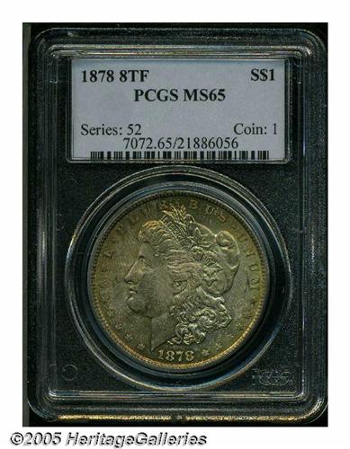 <B>1878 8TF<S$1> MS65 PCGS.</B></I> VAM-14.1. Pastel lime-green, gold, and lavender patina overlays the obverse, while the reverse shows some peripheral pastel aqua and gold-brown color. The design elements are well struck, revealing no hints of softness. A few small contact marks on Liberty's cheek are mentioned for accuracy.