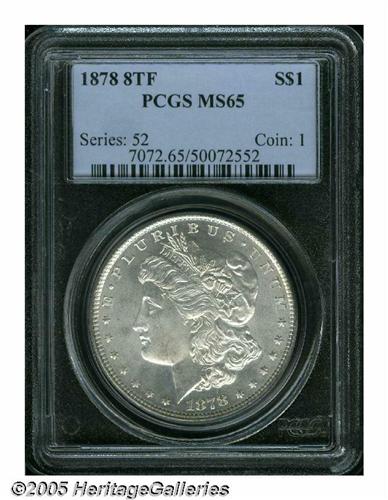 <B>1878 8TF<S$1> MS65 PCGS.</B></I> VAM-17. A Top 100 Variety. Silvery surfaces display a few wisps of light tan color, particularly on the reverse. All of the design elements are well struck, including relatively strong definition in the hair above Liberty's ear. Lustrous surfaces are devoid of significant marks; a couple of minute marks on Liberty's cheek and on the eagle's breast are mentioned for accuracy.