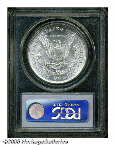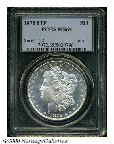 <B>1878 8TF<S$1> MS65 PCGS.</B></I> VAM-17. Lustrous silver-gray surfaces display touches of light tan color on portions of the central devices. The design elements are well struck, save for a little softness in the hair over Liberty's ear. A few minor marks on Liberty's cheek and in the left (facing) obverse field are not bothersome. MS65 and better coins are hard to find; probably less than 2,000 pieces remain. PCGS has graded just 27 examples finer (5/05).
