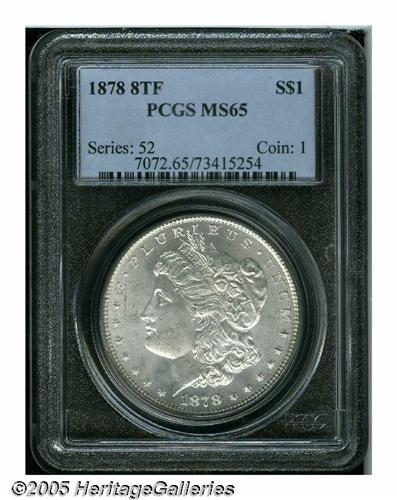 <B>1878 8TF<S$1> MS65 PCGS.</B></I> VAM-17. Untoned with pinpoint sharpness over the central devices and a bare minimum of surface marks. Solid Gem quality for this premier issue and especially desirable as such.
