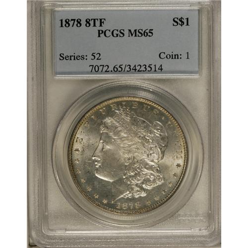 <B>1878 8TF S$1 MS65 PCGS.</B></I> VAM-21. A nicely struck and lightly toned Gem with shimmering semi-prooflike luster and attractive surfaces. Liberty's lower cheek has a small planchet flaw. Die polish has removed a healthy portion of the eagle's plumage, as struck.<BR><BR><b>Shipping:</b> Coin/Currency (<a target="_blank" href="http://www.heritageauctions.com/common/shipping.php">view shipping information</a>)