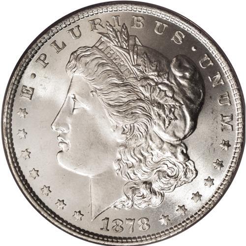 <B>1878 8TF S$1 MS66 PCGS.</B></I> VAM-14.1. This example illustrates the first issued design type of the Morgan dollar, with a flat breast on the eagle. For reasons unknown (endless speculation notwithstanding) the design was soon modified to show a more attractively rendered eagle with a "rounded" breast. This highly lustrous Premium Gem is an excellent representative of the type. It is well struck and untoned, and the only surface disturbances are a few inconsequential blemishes on the reverse that are barely noticeable. Housed in a PCGS holder with a light-green label; a lovely and conservatively graded silver dollar. Population: 28 in 66, 2 finer (4/07).<BR><BR><b>Shipping:</b> Coins & Currency (<a target="_blank" href="http://www.heritageauctions.com/common/shipping.php">view shipping information</a>)