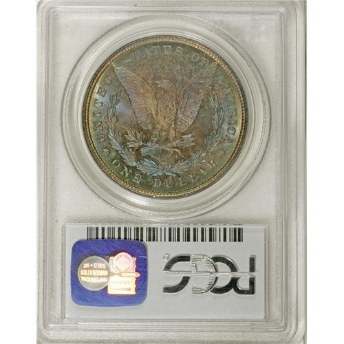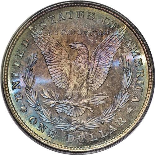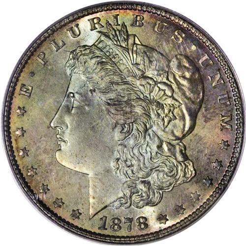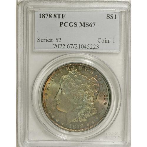 <B>1878 8TF S$1 MS67 PCGS.</B></I> VAM-14.3. In early 1878, the Morgan dollars were issued with eight tail feathers as part of the reverse design. The popular nugget goes that naturalists immediately informed the Mint that they had committed a grave design error, and that eagles' tails have a central feather with equal numbers of feathers on either side, thus they must have an odd number of tail feathers. The legend continues that the Mint quickly changed the design to one with seven tail feathers, although they could have just as easily chosen nine tail feathers. Q. David Bowers writes in <I>Silver Dollars and Trade Dollars of the United States: A Complete Encyclopedia</B></I> that numismatic researcher Eric P. Newman, to assist with Bowers' manuscript, contacted the Raptor Center in St. Louis. Newman discovered that most birds of prey, including the American bald eagle, have <I>12 tail feathers!</B></I> Bowers writes further that various evidence indicates that designer George T. Morgan planned to use seven tail feathers from the very beginning, but that the dies were prepared in haste without attention to minute details: hence the various tail-feathered varieties of 1878; and that in reality, the dies with seven tail feathers have many more minute differences than merely a different number of tail feathers, apparently aesthetic tweaks on Morgan's part.<BR> This example shows minute doubling of the digits in the date, although this is not one of the major varieties for the year, and it is unlisted in the Top 100. This coin abounds with full unbroken cartwheel luster beneath outstanding sea-green, lilac, and gold obverse toning. The reverse has vivid sky-blue color encircled by a thin rim of yellow-green. The strike is exceptional. This Superb Gem is absolutely, strictly original, with enormous aesthetic appeal. An example destined for one of the finest Morgan sets, or a premium and desirable type coin for a discriminating collector. Population: 2 in 67, 0 finer (2/07).<BR><I>From The Jackson Hole Collection.</B></I><BR><BR><b>Shipping:</b> Coins & Currency (<a target="_blank" href="http://www.heritageauctions.com/common/shipping.php">view shipping information</a>)
