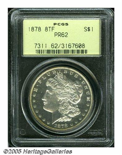 <B>1878 8TF<S$1> PR62 PCGS.</B></I> The 8 Tail Feather proof is decidedly scarce. Mintage estimates range from 250 to 500 pieces; yet, far fewer specimens are known today. Wayne Miller noted in 1982 that he had seen only 30 pieces in fifteen years. This is a mostly brilliant example with just a bit of light golden rim toning on each side, and some wispy hairlines in the field areas that restrict the assigned grade of the piece.<BR><I>From The Dr. John L. Pellegrini Collection.</B></I>