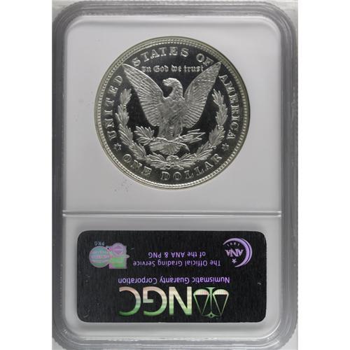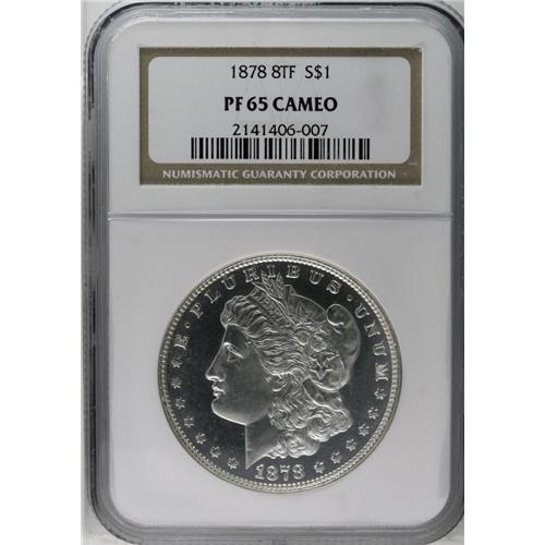 <B>1878 8TF<img border='0' src='http://www.heritagecoins.com/images/star.gif' width=10 height=10>$1> PR65 Cameo NGC.</B></I> VAM-14.3. The 1878 8TF is the initial design of the Morgan dollar series, comparatively overlooked in proof format and even more challenging than the modest mintage of 500 coins would suggest. This dazzling, high grade specimen, unlike the majority of 8TF proofs, is completely brilliant with an appreciable if mild degree of contrast between the fields and the devices. The quality-conscious Morgan dollar collector who prefers brilliant coins would do well to consider this carefully preserved first-year representative.<BR><I>From The Mulholland Collection.</B></I>