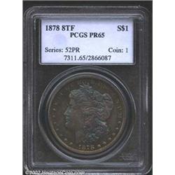 1878 8TF S$1 PR65 PCGS. This is a scarce issue when encountered in the proof format, and of course important as a one-year type coin. While the exact mintage figure is unknown, estimates range from 250 to 500 pieces. Far fewer specimens are extant today. In 1982, Wayne Miller noted that he had seen only 30 pieces over the previous fifteen years. Deeply mirrored and just as deeply toned, the obverse is multicolored while the reverse has bright purplish-rose color over most of that side with cobalt-blue around the margin. Population: 8 in 65, 10 finer (11/01). Important notice: We expect to be auctioning lots at the rate of 200-250 per hour. Sometimes eBay Premier live bid software cannot keep up with that pace, so we strongly recommend that you place a realistic proxy bid now as insurance to avoid disappointment. Also please note that all Heritage/CAA lots purchased through eBay Premier carry a 20% Buyer's Premium.
