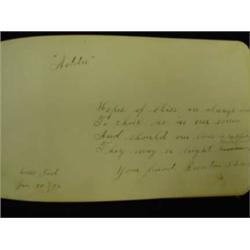 Antique autograph book dated 1878 with calling card of owner "Addie Kirkpatrick".  Fancy work on cover.  Size 7" x 4.25".  Condition:  Very Good