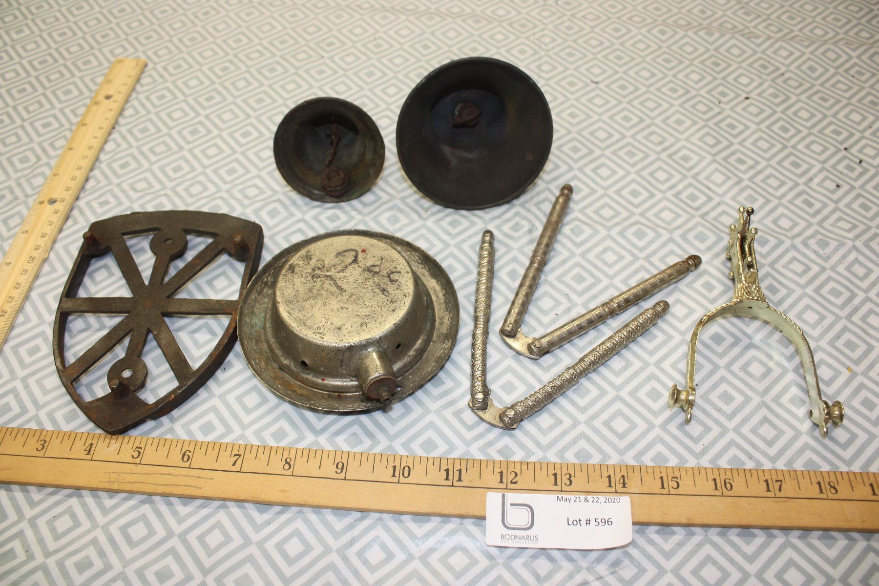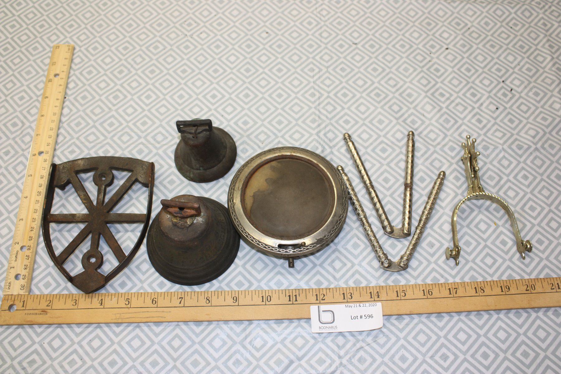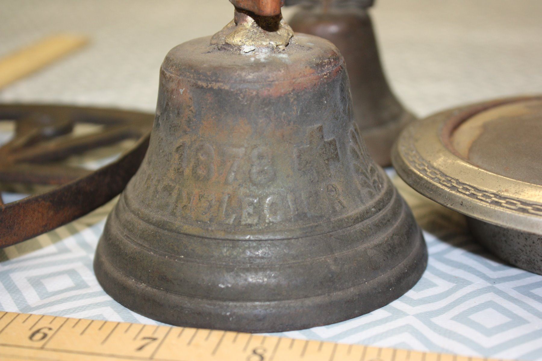 1878 Bell missing clapper and repaired Trivet, Nut Crackers, Single Spur