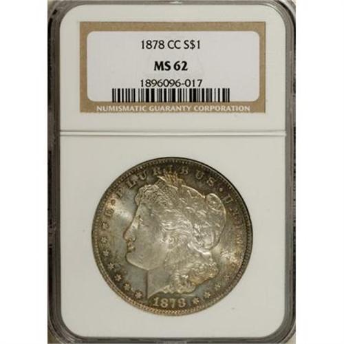 <B>1878-CC $1 MS62 NGC.</B></I> NGC Census: (1396/7973). PCGS Population (2412/12158). Mintage: 2,212,000. Numismedia Wsl. Price for NGC/PCGS coin in MS62: $192. (#7080)<BR><BR><B>Coin Engraver:</B> George T. Morgan<BR><BR><b>Shipping:</b> Coins & Currency (<a target="_blank" href="http://www.heritageauctions.com/common/shipping.php">view shipping information</a>\)