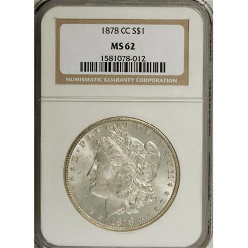 <B>1878-CC $1 MS62 NGC.</B></I> NGC Census: (1425/8047). PCGS Population (2445/12268). Mintage: 2,212,000. Numismedia Wsl. Price for NGC/PCGS coin in MS62: $192. (#7080)<BR><BR><B>Coin Engraver:</B> George T. Morgan<BR><BR><b>Shipping:</b> Coins & Currency (<a target="_blank" href="http://www.heritageauctions.com/common/shipping.php">view shipping information</a>)