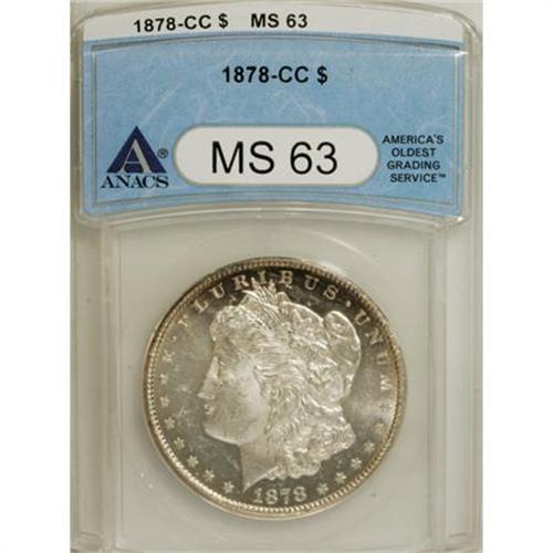 <B>1878-CC $1 MS63 ANACS.</B></I> NGC Census: (3314/4659). PCGS Population (5717/6441). Mintage: 2,212,000. Numismedia Wsl. Price for NGC/PCGS coin in MS63: $308. (#7080)<BR><BR><B>Coin Engraver:</B> George T. Morgan<BR><BR><b>Shipping:</b> Coins & Currency (<a target="_blank" href="http://www.heritageauctions.com/common/shipping.php">view shipping information</a>\)