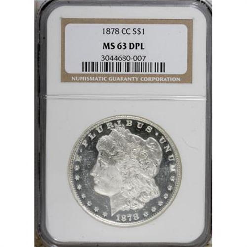<B>1878-CC $1 MS63 Deep Mirror Prooflike NGC.</B></I> A white-on-black Carson City dollar with outstanding contrast and an exemplary strike. Light marks on the left obverse field prevent an even finer assessment.<BR><BR><b>Shipping:</b> Coins & Currency (<a target="_blank" href="http://www.heritageauctions.com/common/shipping.php">view shipping information</a>)
