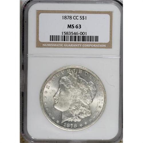 <B>1878-CC $1 MS63 NGC.</B></I> NGC Census: (3327/4675). PCGS Population (5737/6472). Mintage: 2,212,000. Numismedia Wsl. Price for NGC/PCGS coin in MS63: $308. (#7080)<BR><BR><B>Coin Engraver:</B> George T. Morgan<BR><BR><b>Shipping:</b> Coins & Currency (<a target="_blank" href="http://www.heritageauctions.com/common/shipping.php">view shipping information</a>)