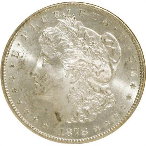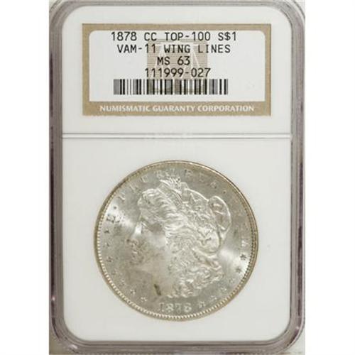 <B>1878-CC $1 Top - 100 MS63 NGC.</B></I> VAM-11 Wing Lines. NGC Census: (3320/4659). PCGS Population (5741/6462). Mintage: 2,212,000. Numismedia Wsl. Price for NGC/PCGS coin in MS63: $308. (#7080)<BR><BR><B>Coin Engraver:</B> George T. Morgan<BR><BR><b>Shipping:</b> Coins & Currency (<a target="_blank" href="http://www.heritageauctions.com/common/shipping.php">view shipping information</a>)
