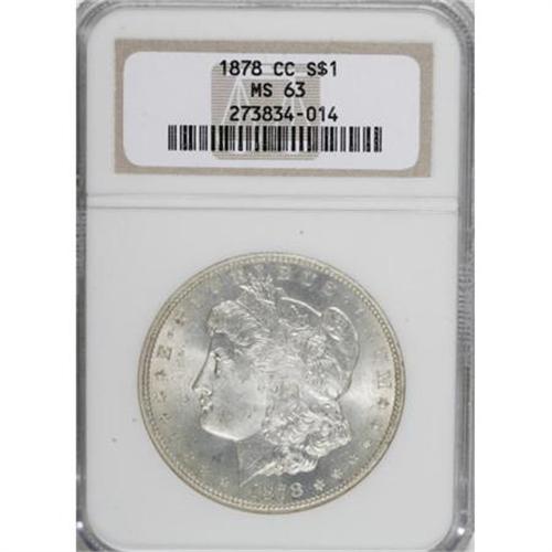 <B>1878-CC $1 MS63 NGC.</B></I> NGC Census: (3354/4693). PCGS Population (5749/6501). Mintage: 2,212,000. Numismedia Wsl. Price for NGC/PCGS coin in MS63: $308. (#7080)<BR><BR><B>Coin Engraver:</B> George T. Morgan<BR><BR><b>Shipping:</b> Coins & Currency (<a target="_blank" href="http://www.heritageauctions.com/common/shipping.php">view shipping information</a>)