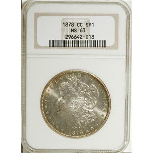 <B>1878-CC $1 MS63 NGC.</B></I> NGC Census: (3354/4693). PCGS Population (5805/6571). Mintage: 2,212,000. Numismedia Wsl. Price for NGC/PCGS coin in MS63: $308. (#7080)<BR><BR><B>Coin Engraver:</B> George T. Morgan<BR><BR><b>Shipping:</b> Coins & Currency (<a target="_blank" href="http://www.heritageauctions.com/common/shipping.php">view shipping information</a>)